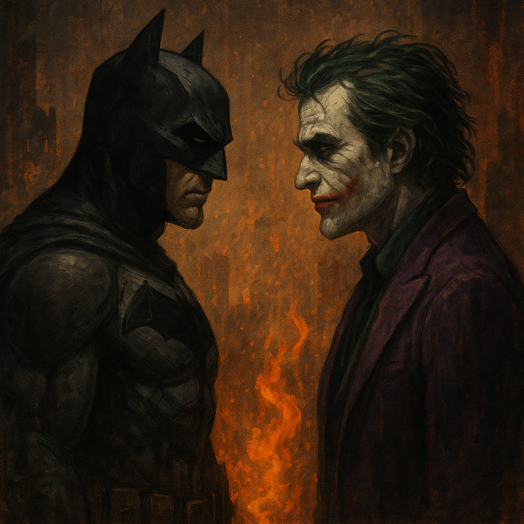 Batman y el Joker: uno representa el orden forjado en el dolor; el otro, el caos sin empatía. El asesinato de los padres de Bruce Wayne —cometido por un criminal anónimo, indiferente— rompe su mundo. Ese acto sin sentido deja una herida que con los años se vuelve propósito. Bruce no puede cambiar el pasado, pero elige convertir su pérdida en camino. Así nace Batman: no como venganza, sino como respuesta. Y años después, el Joker se convierte en la encarnación de esa sombra que Bruce no ha dejado de mirar: el crimen sin alma, el mal que ríe mientras destruye. Batman no busca eliminarlo, sino contenerlo. Cada vez que se enfrentan, se reaviva la pregunta: